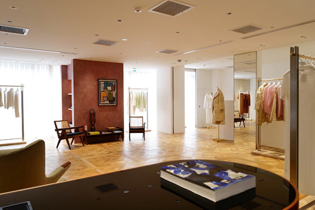 1・2階の2フロアにわたる空間デザインは、以前より同ブランドの店舗づくりに携わってきたアーティストのEnzo氏が引き続きディレクションし、ニュアンスのあるピンク色のR壁や、レザー仕上げのハンガーバーなど、細部にまでこだわりブランドの世界観を表現しています。